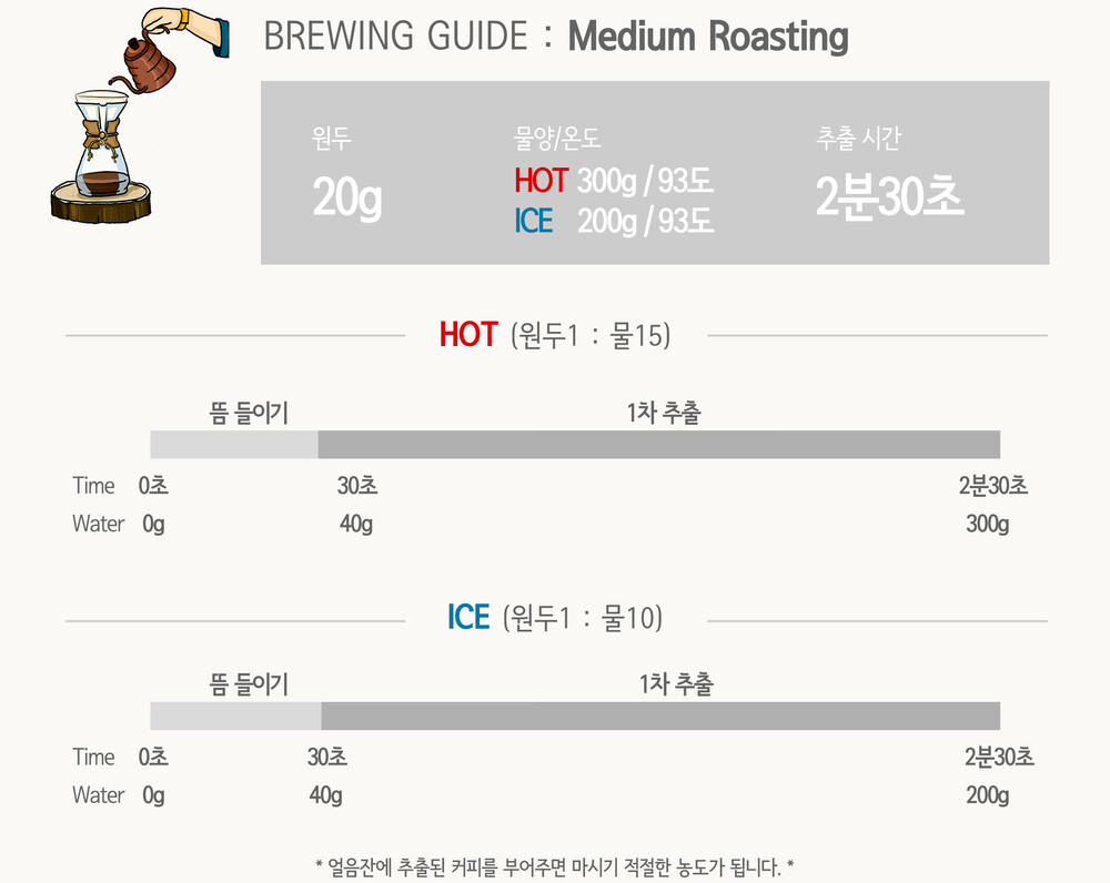 - 원두 상미기간 안내: 자사 원두 상미기간 테스트 결과, 로스팅 후 일주일~5주 사이에 가장 좋은 맛을 느낄 수 있습니다.
