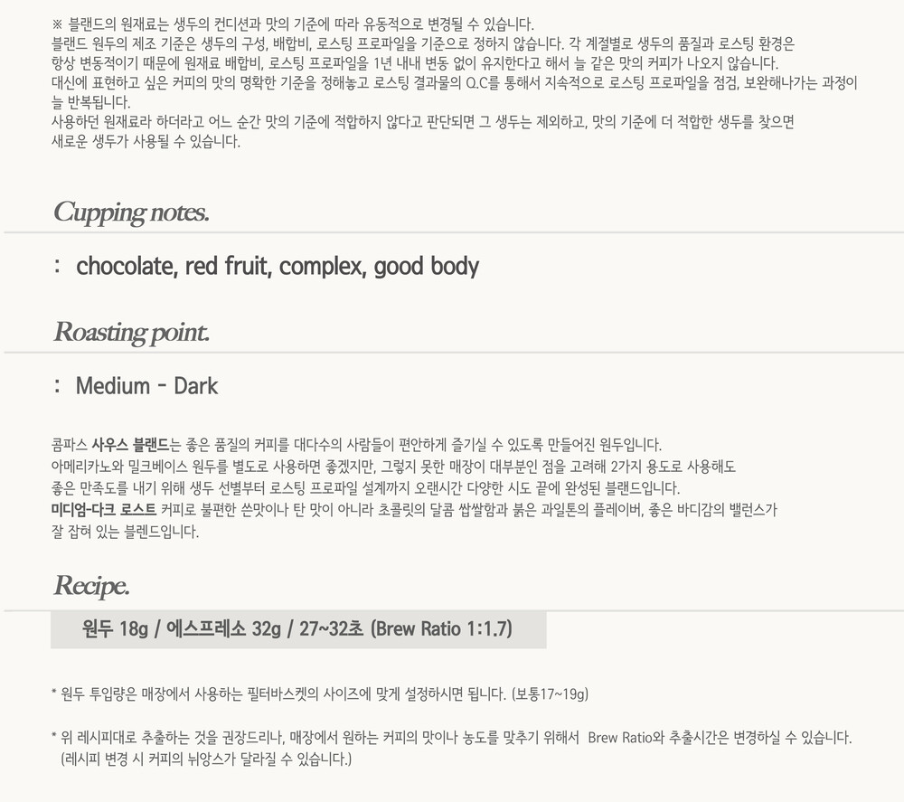 - 원두 상미기간 안내: 자사 원두 상미기간 테스트 결과, 로스팅 후 일주일~5주 사이에 가장 좋은 맛을 느낄 수 있습니다.